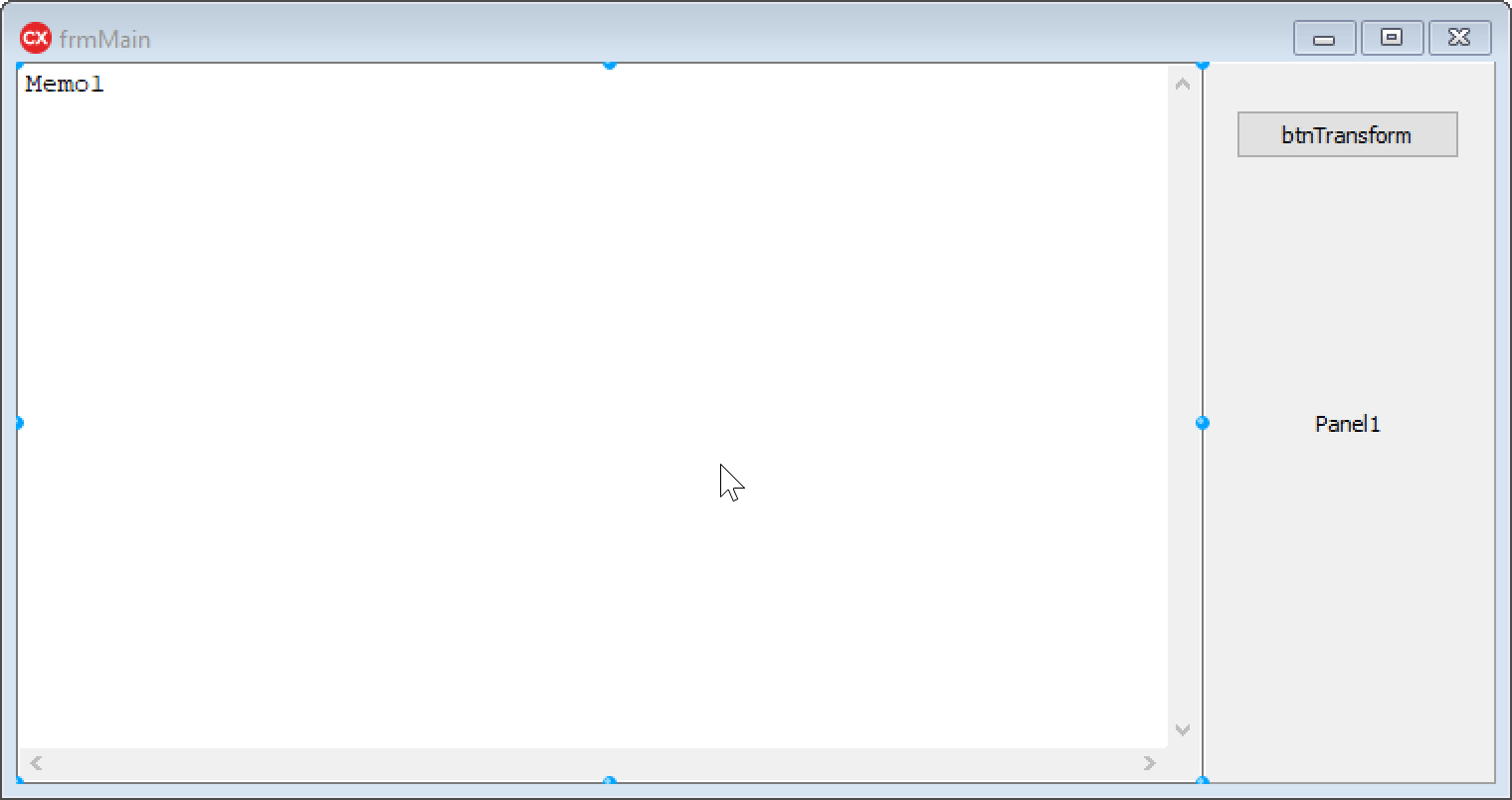 Für das Memofeld habe ich die Schriftart auf "Courier New" gesetzt, außerdem die Eigenschaft "ScrollBars" auf "ssBoth". Nach dem das Programm gestartet ist, kann ich den gewünschten Quellcode in das Memofeld kopieren und den Schalter zum Transformieren drücken.